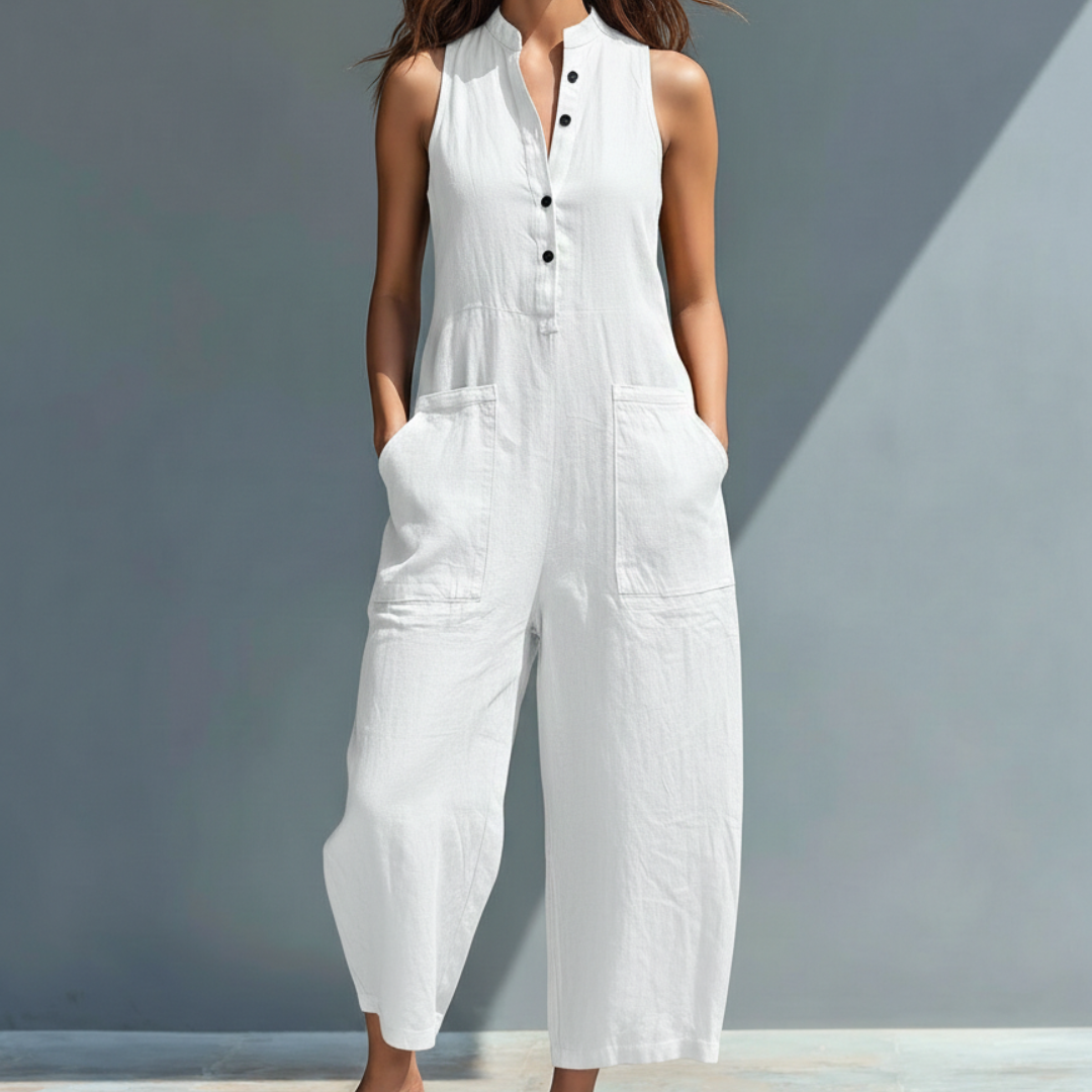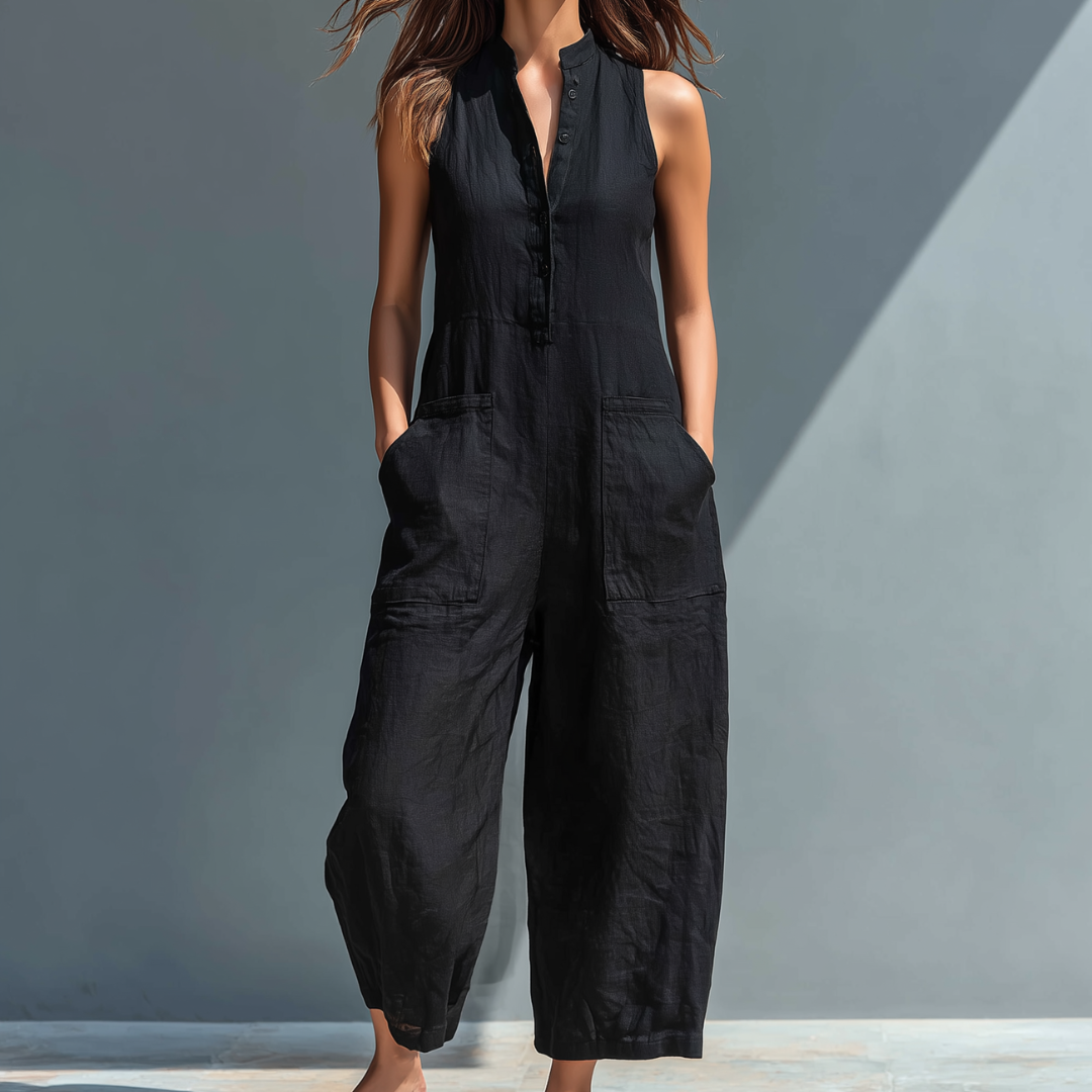 The Lucinda Jumpsuit is designed for women who appreciate comfort, simplicity, and timeless style. The relaxed sleeveless silhouette creates a light and effortless feel, while the refined mandarin collar adds a clean, polished touch. Perfect for warm days and a variety of occasions, this piece offers a balanced look that feels both elegant and easy to wear.